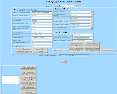 ConfigMgr Client Troubleshooter — ещё одна утилита, показывающая состояние клиента SCCM. Кроме информации о состоянии сервисов и просмотра логов, можно получить информацию об операционной системе, установить клиента, обновить политики, перезапустить назначенные объявления и т.д.