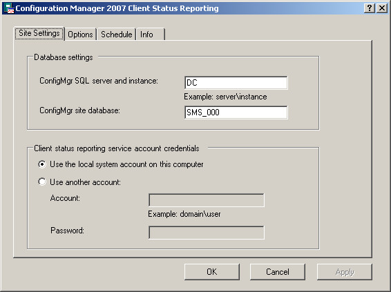 Далее заходим в Start — Programs — Microsoft Configuration Manager 2007 R2 Client Status Reporting и запускаем программу конфигурации. Указываем размещение базы данных и аккаунт, который будет заносить информацию в базу: